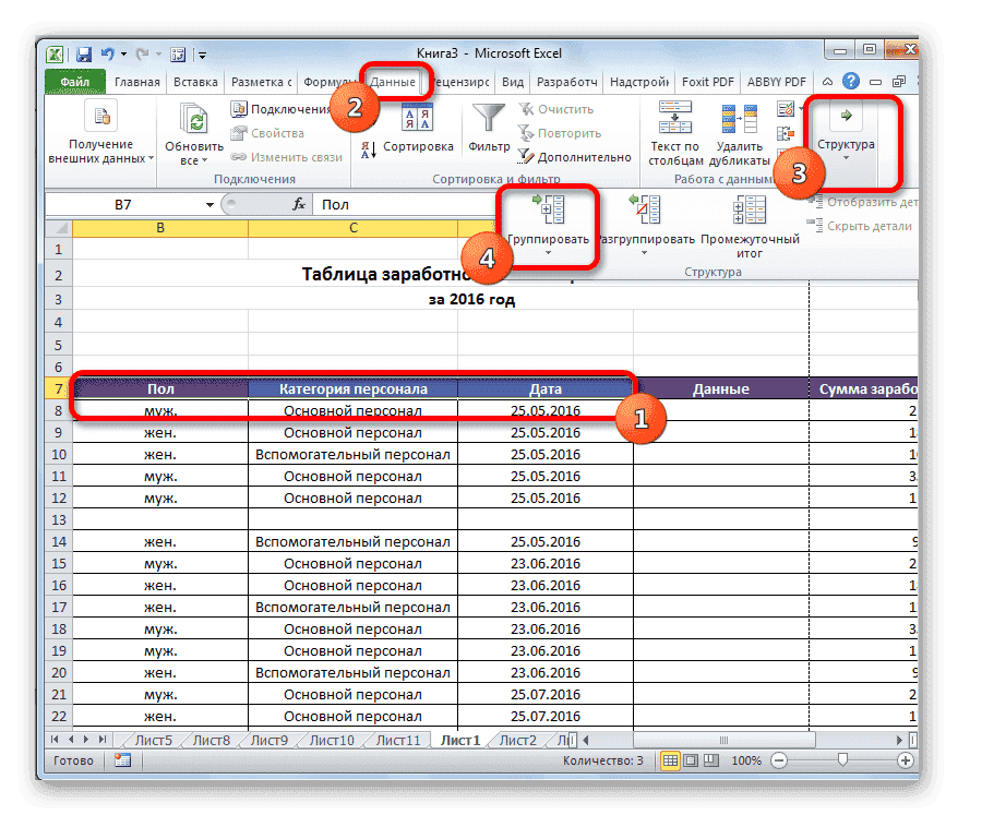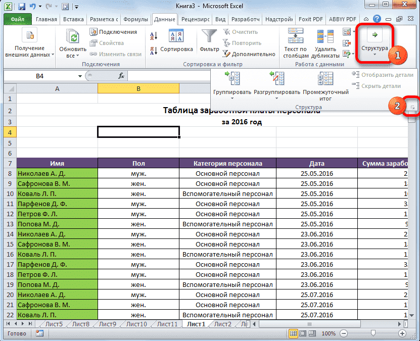 Excel позволяет применять более одной группировки в таблице. Например, вы можете создать область с годовым доходом, другую квартальную и третью ежемесячную. Всего можно создать 9 категорий. Это называется группировкой по уровням. Как его создать: