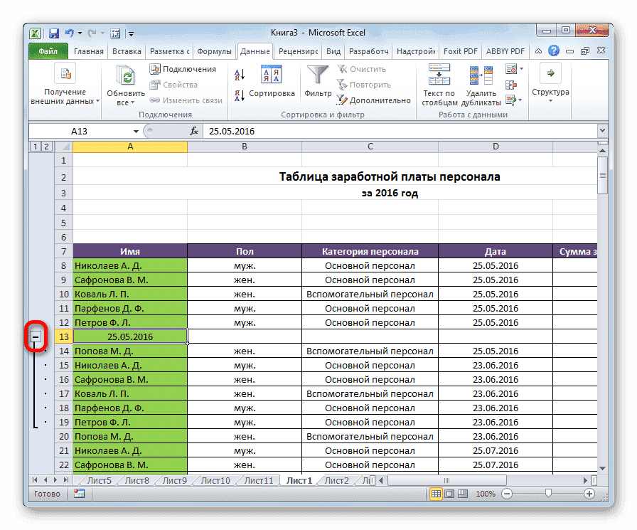Группа готова. Точно так же, как и в случае с группировкой столбцов, его можно свернуть и развернуть, щелкнув знаки минус и плюс соответственно.