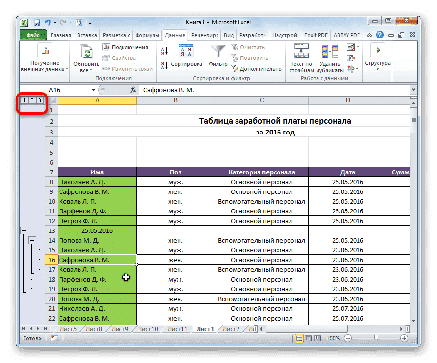 - Сгруппируйте все столбцы, как мы делали раньше. Таким образом, вы получите намного больше преимуществ и недостатков на левой стороне. Вы также можете переключаться между уровнями, нажимая на вкладки с цифрами на той же панели вверху.