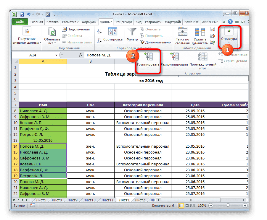 Выделите ячейки в столбцах, которые мы собираемся сгруппировать, кроме столбца с именем. Щелкните кнопку «Группа».