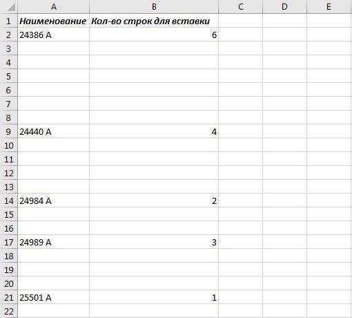 Надстройка может вставлять переменное количество пустых строк, если количество вставляемых строк указано в отдельном столбце.