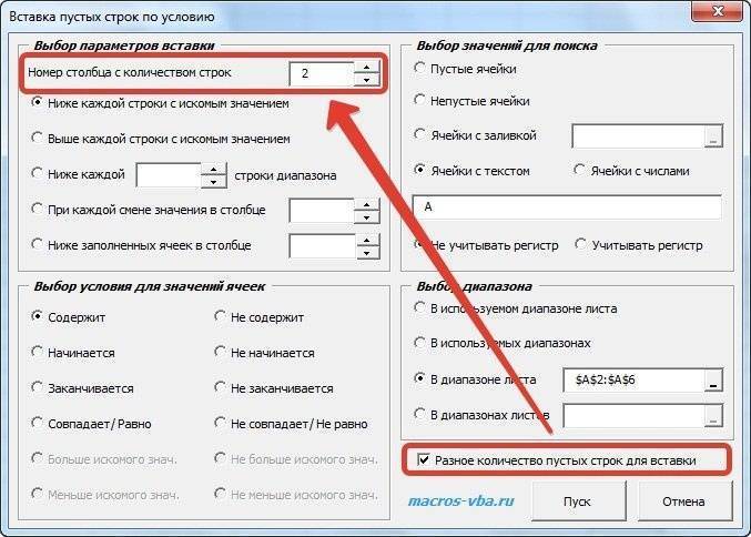 В результате программа определяет номер строки, который соответствует условиям, заданным пользователем, и вставляет указанное количество пустых строк в эту строку указанного столбца.