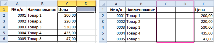 Или выберите два заголовка столбца C и D, щелкните правой кнопкой мыши и выберите параметр «Вставить».