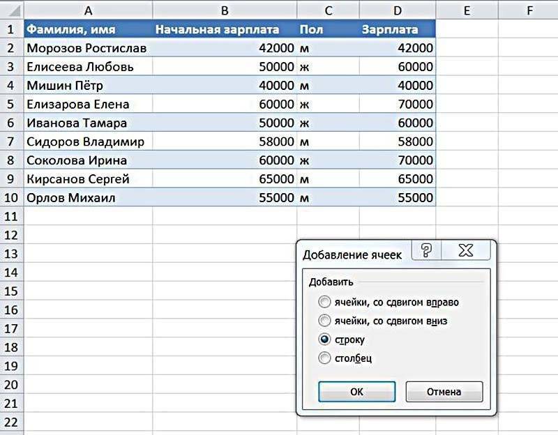 Тогда между строками №4 и №5 сразу появится пустая строка. Программа уже знает общий выбор строки на листе. Следовательно, нет необходимости в появлении меню с вопросом, что именно добавить (шаг 3).