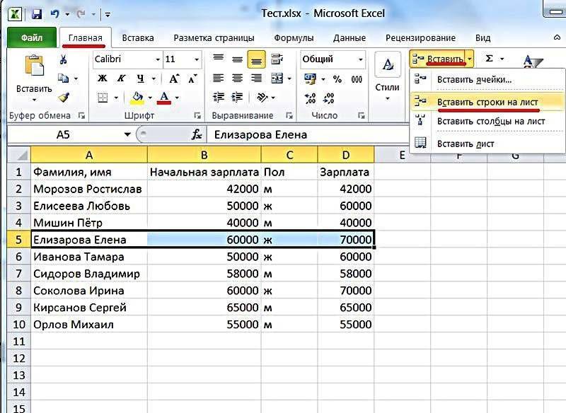 Вы также можете вставить пустую строку с помощью кнопок на панели инструментов. Для этого выберите строку, над которой вы хотите вставить новую пустую строку. Далее перейдите на вкладку «Главная», в группе «Ячейки» откройте меню кнопки «Вставить», выберите пункт «Вставить строки в лист».