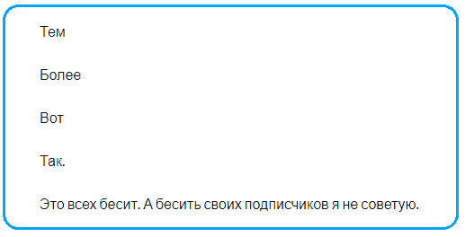 Мы думаем логически. Когда нужно разбивать текст на логические блоки? Когда он большой. Но это касается только подписей к публикациям. Только они могут быть большими, описание аккаунта может быть не более 150 символов. И там уместны будут только логически обоснованные переводы строки. Короткие подписи к сообщениям разделять не нужно.