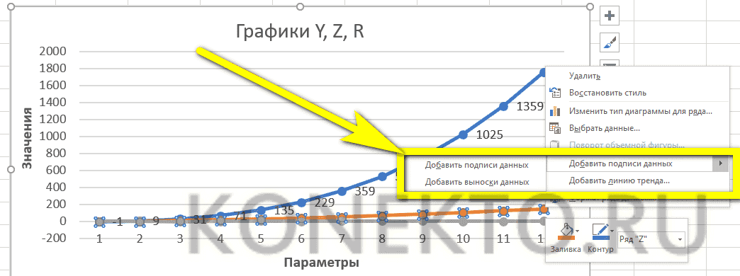 - Чтобы добавить метки (размещенные непосредственно на сетке) или выноски данных (в отдельных окнах) в любую строку диаграммы, вам необходимо выбрать их, щелкнув правой кнопкой мыши и выбрав соответствующий параметр в подменю «Добавить метки данных».
