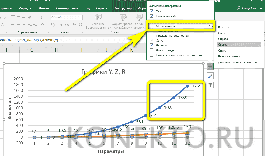 В нашем случае на диаграмме две линии. Первый красный. Второй - синий. Последний нам не нужен, поэтому мы можем удалить его, выделив его и нажав кнопку «Удалить». Так как у нас всего одна линия, также возможно удалить легенду (блок с названиями отдельных линий графика). Но у бомбардиров имя получше. Найдите панель «Инструменты диаграммы» и блок «Метки данных» на вкладке «Макет». Здесь нужно определить положение чисел.