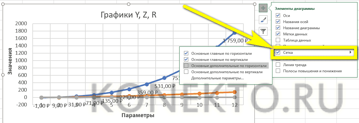 - Сетка, позволяющая найти значения графика в каждой точке, с помощью того же меню можно полностью удалить или добавить основные и вспомогательные знаки.