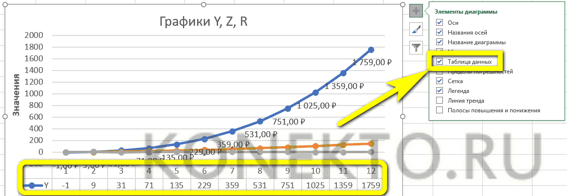 - Чтобы добавить таблицу с данными прямо на диаграмму, вам нужно вызвать те же «Дополнительные параметры», нажав на знак плюса и установив флажок с таким же именем.