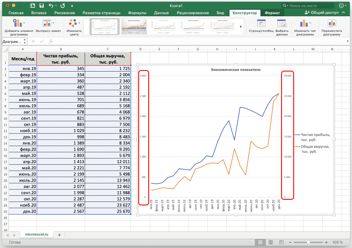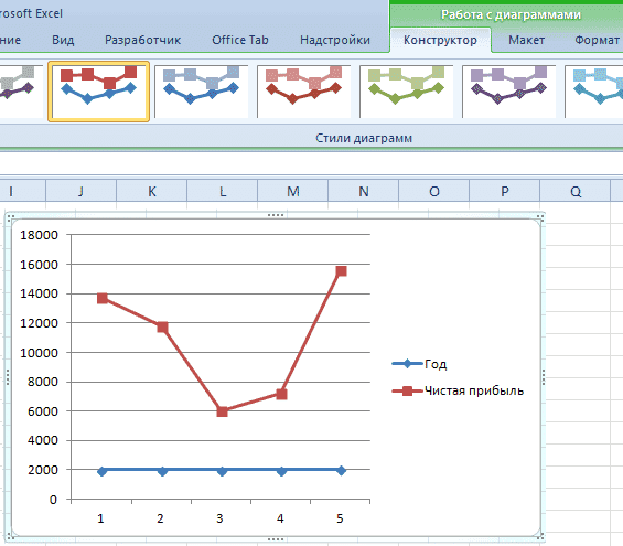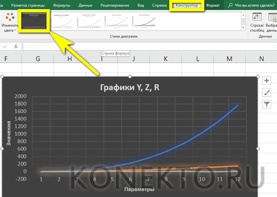 Но в целом можно все оставить, программа работает неплохо. Но если вам нужно создать привлекательный дизайн диаграммы, к вашим услугам вкладка «Конструктор», которая позволяет вам указать цвет фона диаграммы, его шрифт и разместить его на другом листе.