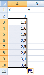 Итак, нам нужно сформировать таблицу из двух столбцов. Первая - это горизонтальная ось (т.е. X), вторая - вертикальная (Y) ось. Вторая строка содержит первое значение, в нашем случае это единица. В третьей строке нужно написать значение, которое будет на 0,3 больше предыдущего. Сделать это можно как с помощью самостоятельных вычислений, так и напрямую написав формулу, которая в нашем случае будет такой: