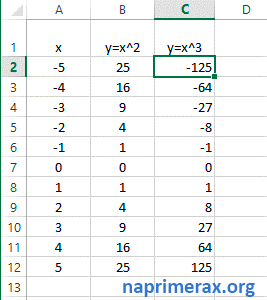 Перейдем к вопросу о том, как построить две диаграммы в Excel. Добавим еще один график кубической параболы. Создаем еще один столбец в таблице (столбец C), в который вводим формулу кубической параболы. Наша таблица теперь выглядит так:
