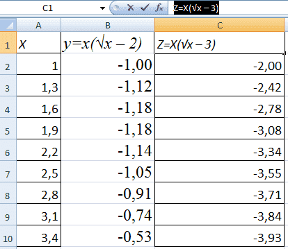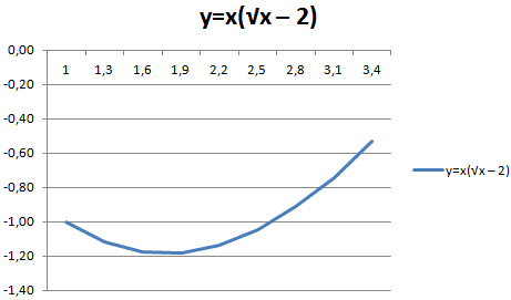 - Создайте таблицу, которая будет служить источником информации. Во-первых, вы должны решить, какая функция будет использоваться именно в вашем случае. Например, y = x (√x - 2). При этом мы выберем 0,3 в качестве шага для использования.