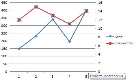 Часто возникает необходимость разместить на диаграмме несколько графиков. В этом нет трудностей, если у них одинаковая расчетная мера. Но иногда бывает необходимо объединить несколько графиков с разными расчетными показателями, например, чтобы показать зависимость одних данных от других. Это делается следующим образом.