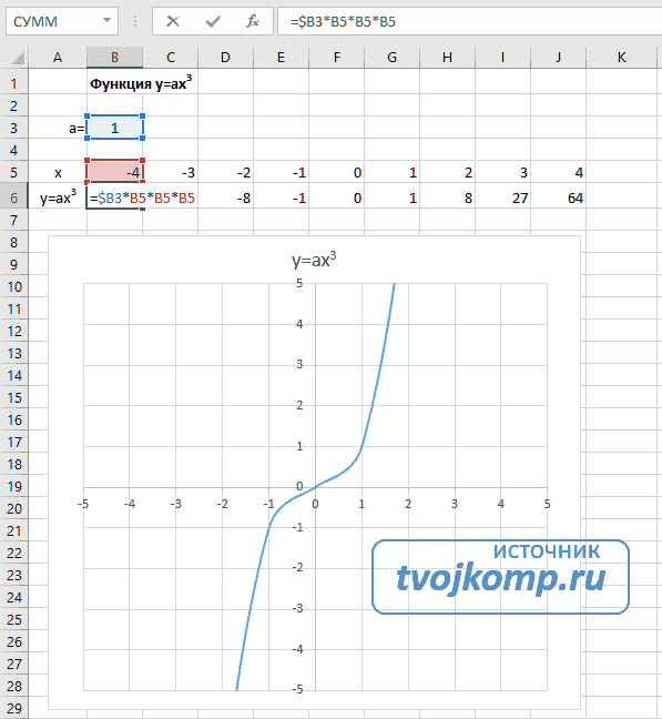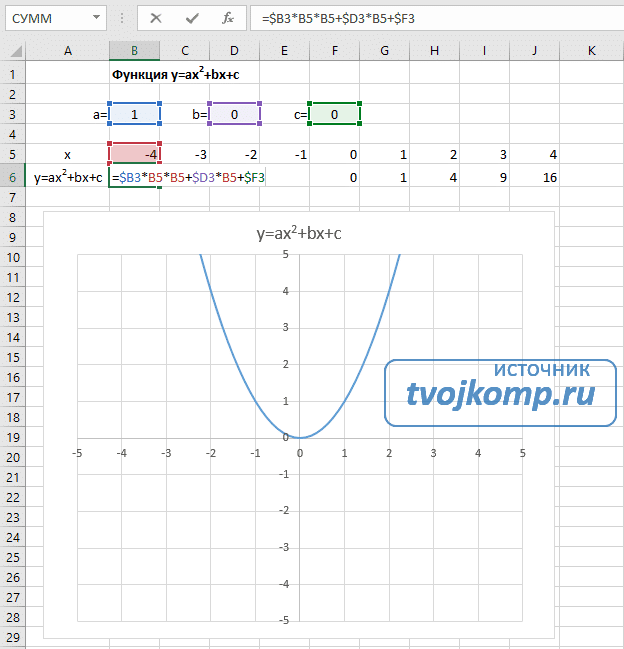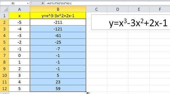 вам необходимо вычислить значения функции в этих точках. Для этого в ячейке B2 мы создадим формулу, соответствующую заданной функции, только вместо x мы введем значение переменной x, находящейся в ячейке слева (-5).