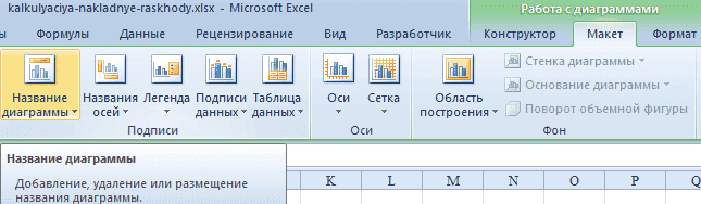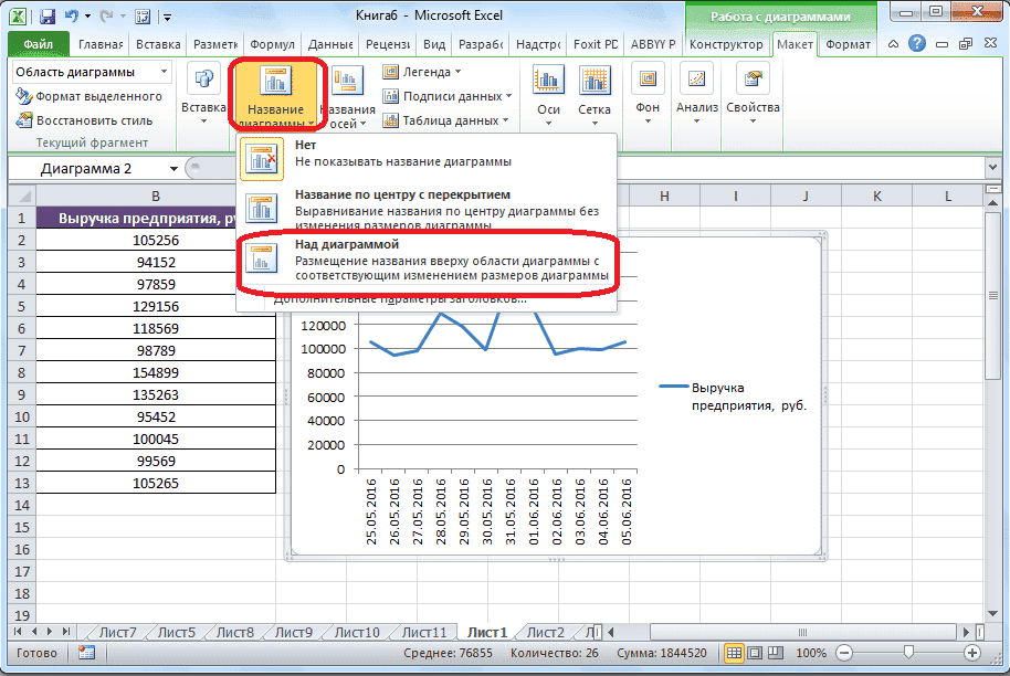 - Чтобы подписать диаграмму, перейдите на вкладку «Макет» мастера диаграмм. Нажмите кнопку на ленте с названием «Имя диаграммы». В открывшемся списке укажите, где будет размещено название: в центре или над графиком. Второй вариант обычно более уместен, поэтому давайте возьмем в качестве примера «Над графиком». В результате появляется имя, которое можно заменить или изменить по своему усмотрению, просто щелкнув по нему и введя нужные символы с клавиатуры.
