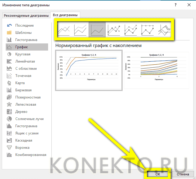Нас интересует тип «Графика». После нажатия на соответствующую кнопку появится окно с настройками внешнего вида будущего графика. Чтобы выяснить, какой вариант подходит для конкретного случая, вы можете навести указатель мыши на конкретный тип, и появится соответствующее приглашение.