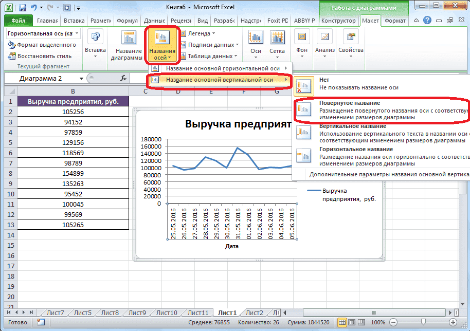 - Таким же образом подписываем вертикальную ось. Нажмите кнопку «Имя оси», но в появившемся меню выберите «Имя основной вертикальной оси». Откроется список из трех вариантов положения подписи: повернутый, вертикальный, горизонтальный. Лучше использовать повернутое имя, так как это экономит место на листе.
