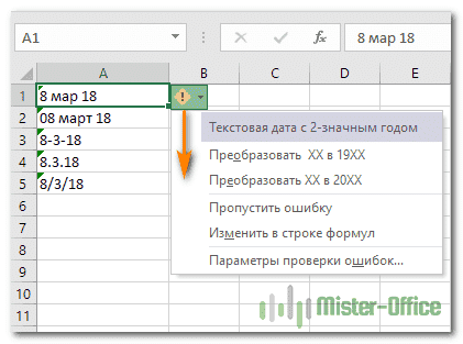 При нажатии на восклицательный знак появятся различные параметры, связанные с вашими данными. В случае двузначного года программа спросит вас, хотите ли вы преобразовать его в 19XX или 20XX.