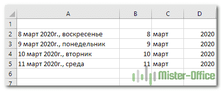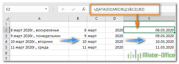 Давайте рассмотрим другой способ превратить сложную формулировку в дату. Столбец A содержит даты в виде текстовых выражений формы «08 марта 2020». Сразу отметим, что записи должны быть единообразными, то есть все числа хранятся в двузначном формате: 01, 07, 08, 10, 12 и так далее