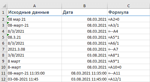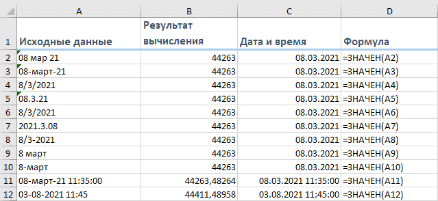 Как видите, математические операции могут помочь с датами (строки 3,4, 5,7), временем (строки 2 и 6) и числами, отформатированными как текст (строка 8).