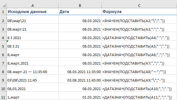 А текстовые строки преобразуются в даты с использованием единой формулы.