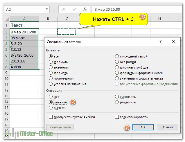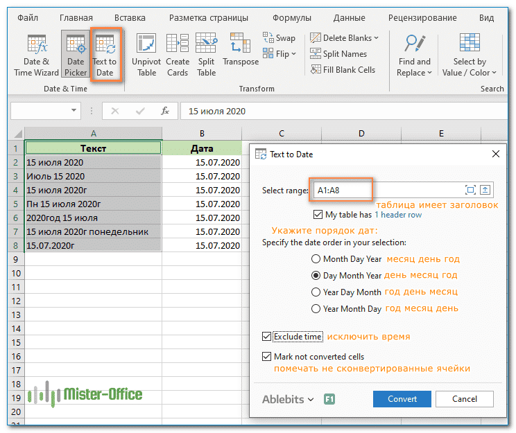 Чтобы преобразовать дату в виде текста в обычную дату, выполните следующие действия: