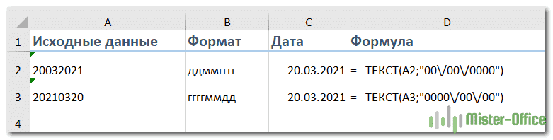 Например, давайте посмотрим, как преобразовать 20032021 (хранится в ячейке A2) в 20.03.2021.