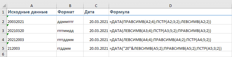 = ДАТА (ВПРАВО (A2,4); СРЕДНИЙ (A2,3,2); ЛЕВЫЙ (A2,2))