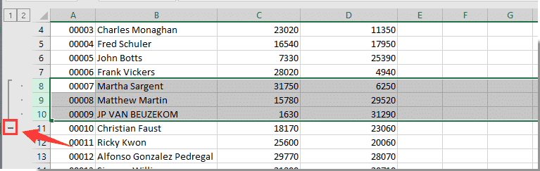2. Знак минус отображается слева от выбранных строк или отображается вверху выбранных столбцов. Щелкните знак «минус», выбранные строки или столбцы немедленно скрываются. И щелкните знак плюса, скрытые строки или столбцы появятся сразу же.