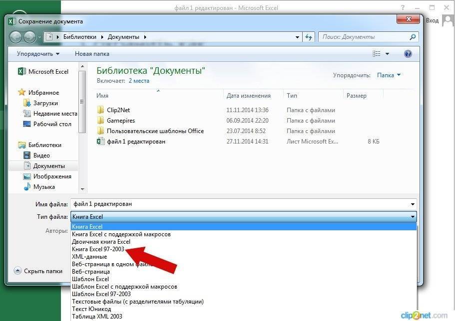 В открывшемся окне выберите тип файла «Книга Excel 97-2003».