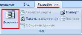 - Откройте инструмент «Разработчик». Диалоговое окно "Источник" на вкладке XML.