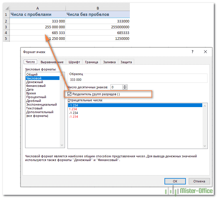 Иногда форматирование является причиной появления ненужных пробелов в числах. Он уже может быть установлен ранее или перенесен вместе с данными из внешнего источника. Чтобы все исправить, нужно щелкнуть правой кнопкой мыши вкладку «Формат ячеек». Появится список настроек, нужно выбрать вкладку «Число», где можно настроить наличие разделителей групп цифр.