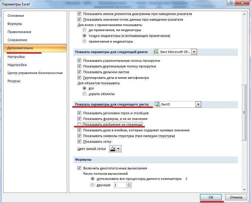 В категории «Дополнительно» в разделе «Показать параметры для следующего листа» установите или снимите флажок «Показывать разбиение на страницы», чтобы включить или отключить отображение разрывов страниц в обычном режиме соответственно.