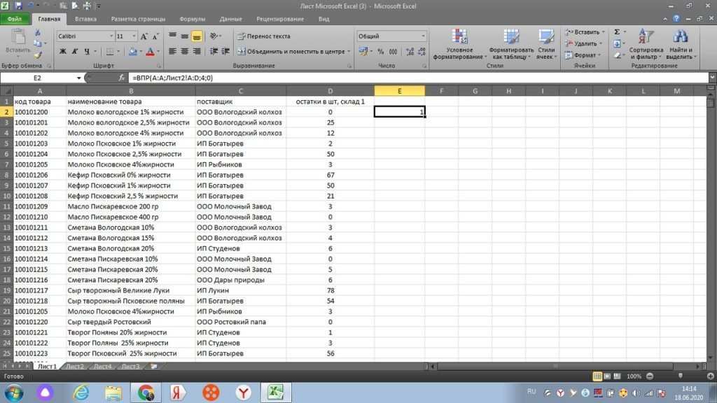 Затем нажмите «ок» и в столбце «Д» отобразится цифра 1. Это означает, что для продукта 100101200 Молоко Вологда 1% жирности, есть только один продукт этого типа, дубликатов нет. См. Рисунок 5.
