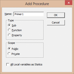 - Введите имя процедуры в поле «Имя»: «Primer1» или скопируйте его отсюда и вставьте в поле «Имя». Нажмите кнопку ОК, чтобы добавить в форму первую и последнюю строки процедуры.