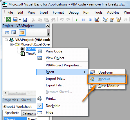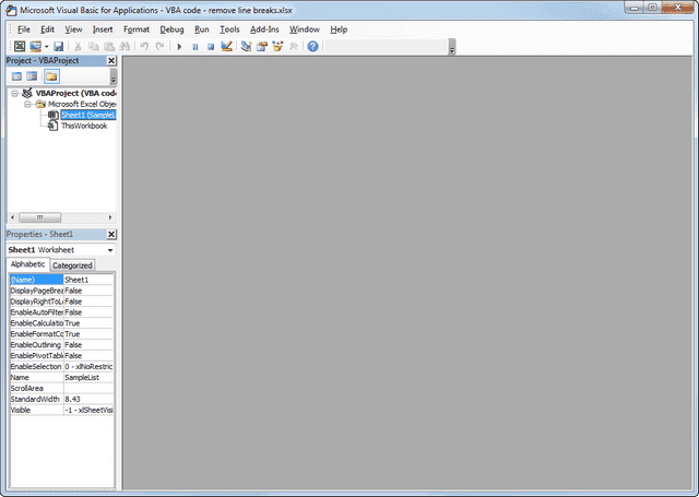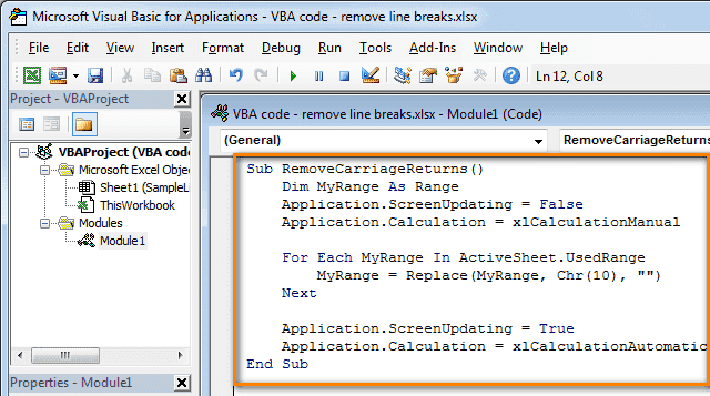 В этом примере мы будем использовать макрос VBA, который удаляет разрывы строк из ячеек текущего листа Excel.