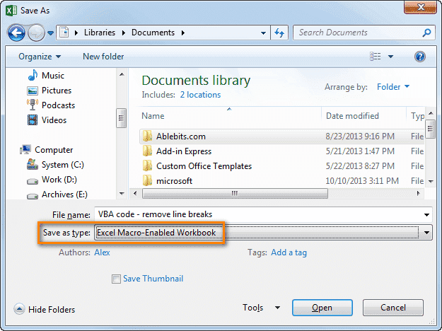 Откроется диалоговое окно «Сохранить как». В раскрывающемся списке Тип файла выберите книгу Excel с поддержкой макросов и нажмите кнопку Сохранить).