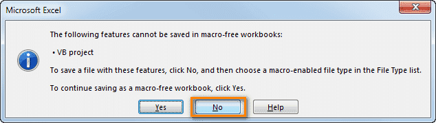 - Давайте сохраним книгу как книгу Excel с поддержкой макросов. Для этого нажмите Ctrl + S и в окне с предупреждением Следующие функции нельзя сохранить в книге без макросов, нажмите Нет).