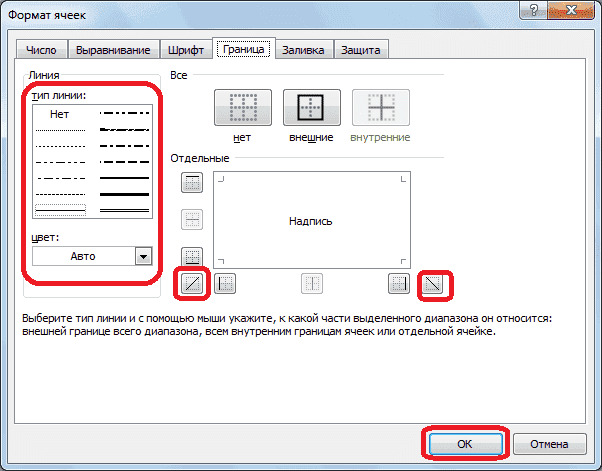 - Рядом с окном «Ярлык», расположенным в центре, нажмите на одну из двух кнопок, которые представляют собой наклонную линию, наклоненную справа налево или слева направо. Выбираем тот вариант, который вам нужен. Вы также можете выбрать тип и цвет линии. После того, как вы сделали свой выбор, нажмите кнопку «ОК».