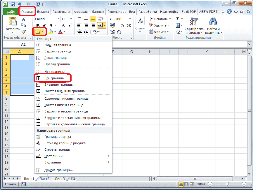 - Для наглядности, чтобы лучше увидеть, чего мы достигли, давайте установим пределы. Выделите весь диапазон ячеек, который мы планируем выделить для таблицы. На той же вкладке «Главная» в панели инструментов «Шрифт» щелкните значок «Границы». В появившемся списке выберите пункт «Все ребра».
