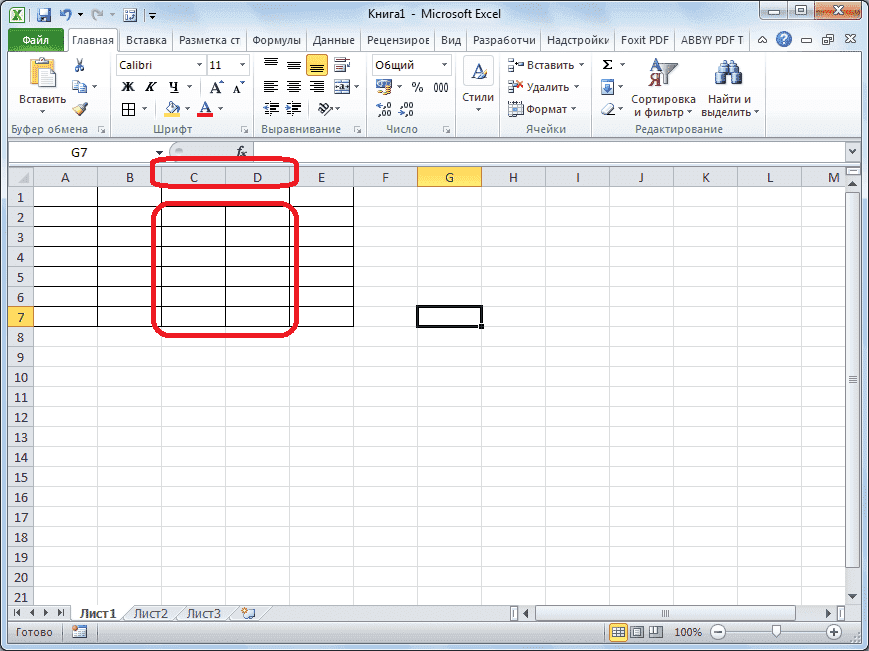 Если нам нужно разделить ячейку не в заголовке, а в центре таблицы, то в этом случае проще объединить все ячейки двух соседних столбцов и только потом разделить нужную ячейку.