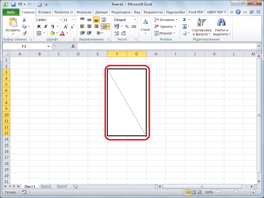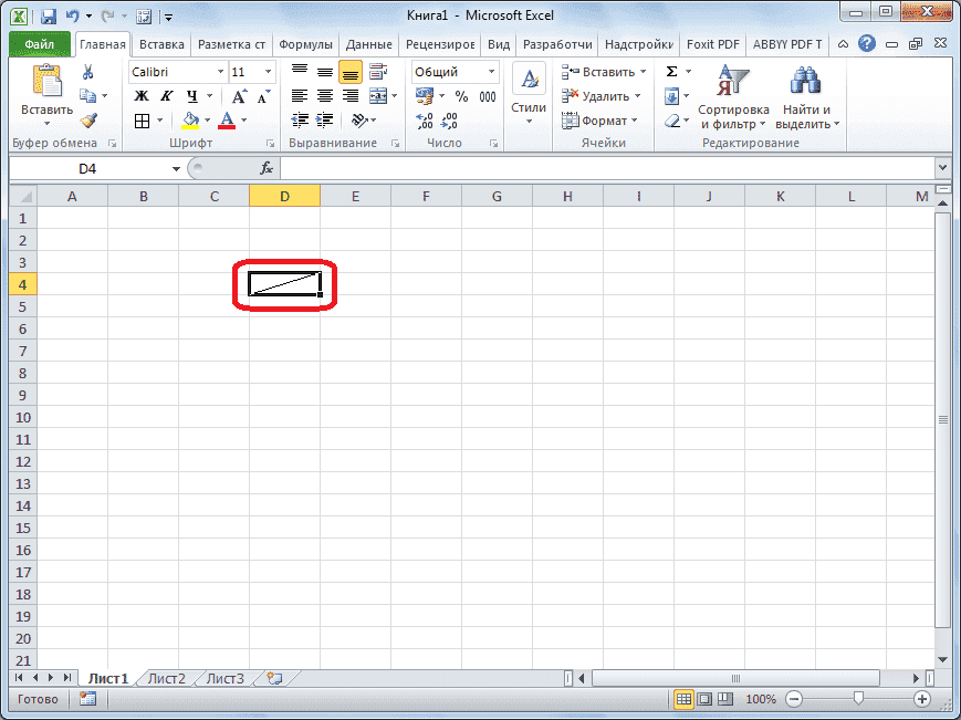 Далее ячейка будет разделена по диагонали косой чертой вперед. Однако необходимо учитывать, что Excel воспринимает разделенную таким образом ячейку как единый элемент.