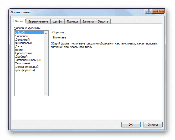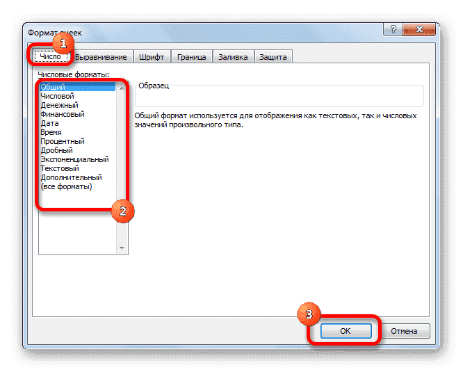 Если открыть окно «Формат ячеек» через контекстное меню, необходимые настройки будут найдены на вкладке «Число» в блоке параметров «Форматы чисел». Фактически, это единственный блок на данной вкладке. Здесь вы можете выбрать один из форматов данных: