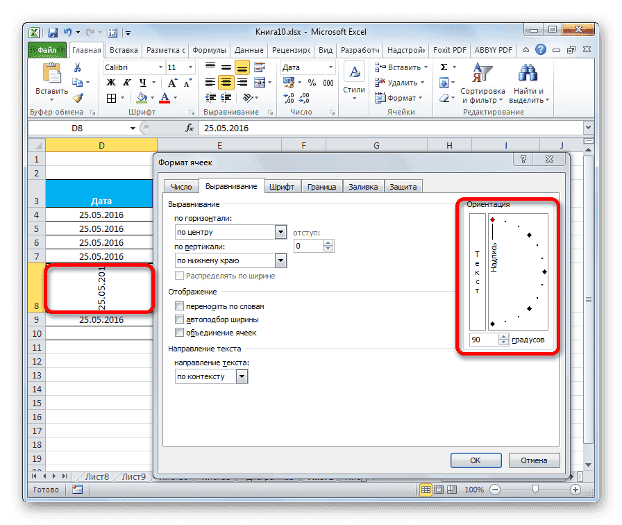 В параметре «Ориентация» вы можете настроить угол наклона текста в ячейке таблицы.