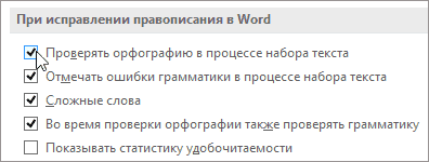 Установите или снимите флажок Проверять орфографию при вводе. Кроме того, в приложениях с автоматической проверкой грамматики вы можете установить или снять флажок Отмечать грамматические ошибки при вводе.