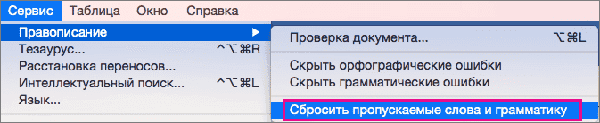 Примечание. Список пропущенных слов и грамматики сбрасывается только для открытого в данный момент документа. Это действие не исправляет орфографические и грамматические ошибки, которые вы игнорируете в других документах Word.