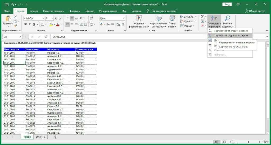 Сортировка данных в Excel