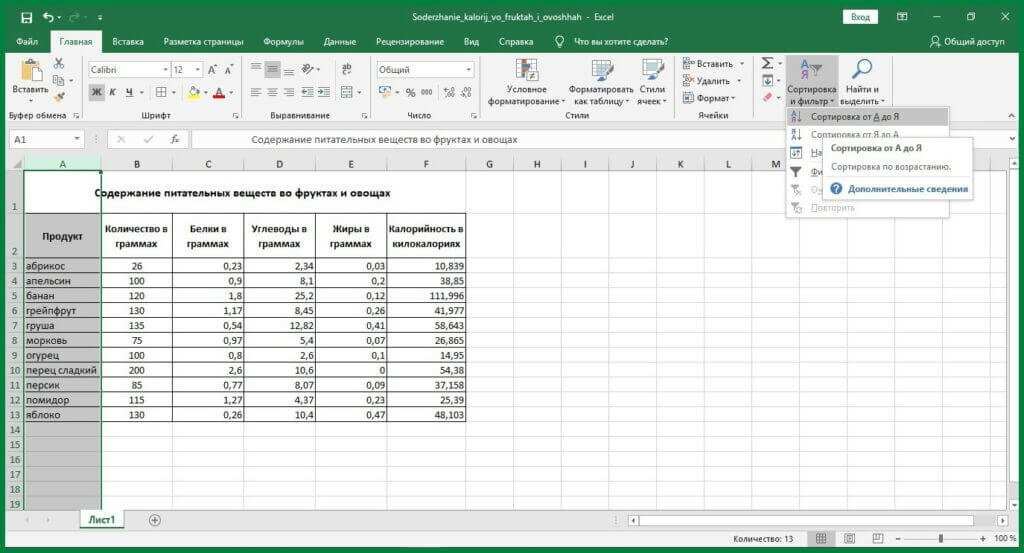 Поскольку в большинстве таблиц числовые параметры привязаны к тексту - фамилии или названию товара, то удобно сортировать его по алфавиту. Рассмотрим особенности работы с этим инструментом в редакторе Excel на примере таблицы «Содержание питательных веществ в овощах и фруктах».